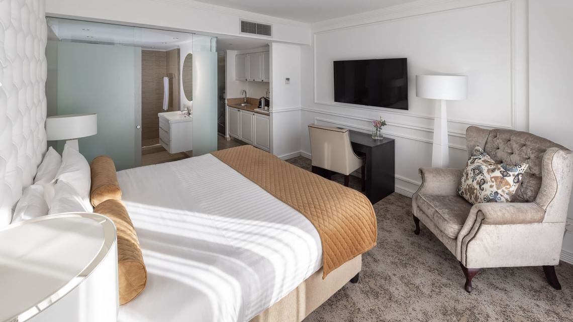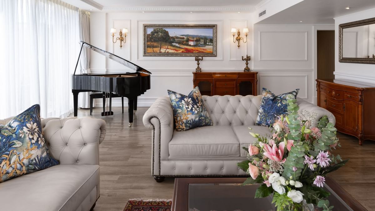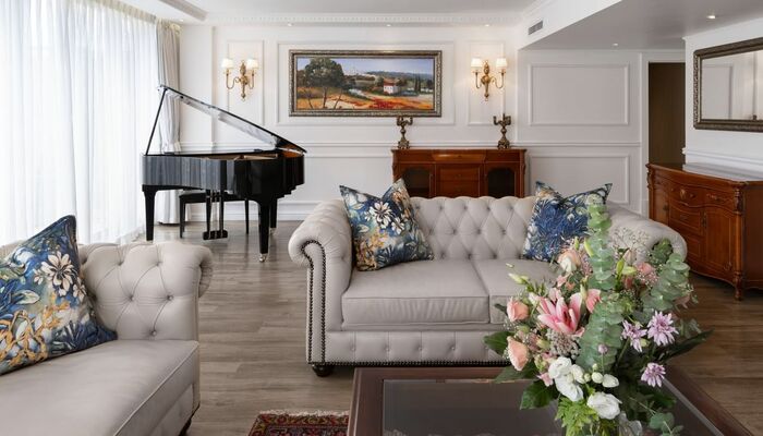 Nuestra suite Premier de dos dormitorios ofrece 60 m² (646 pies²) de espacio con detalles depurados y clásicos.