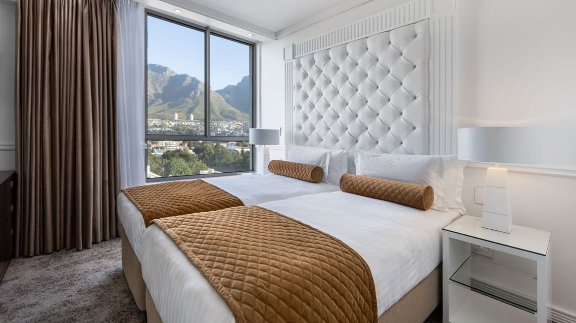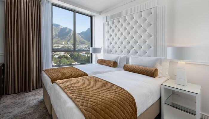 Nuestras Suites de Dos Dormitorios ofrecen espacios de 60 m² (646 pies²) que incluyen un comedor, una cocina americana y dos habitaciones independientes, cada una con baño privado. El interior de estas soleadas suites es fresco e impecable. Algunas de nuestras suites de dos dormitorios cuentan con balcones con vistas a lugares emblemáticos de Ciudad del Cabo, como la Montaña de la Mesa, Signal Hill, el centro de la ciudad o la Bahía de la Mesa.