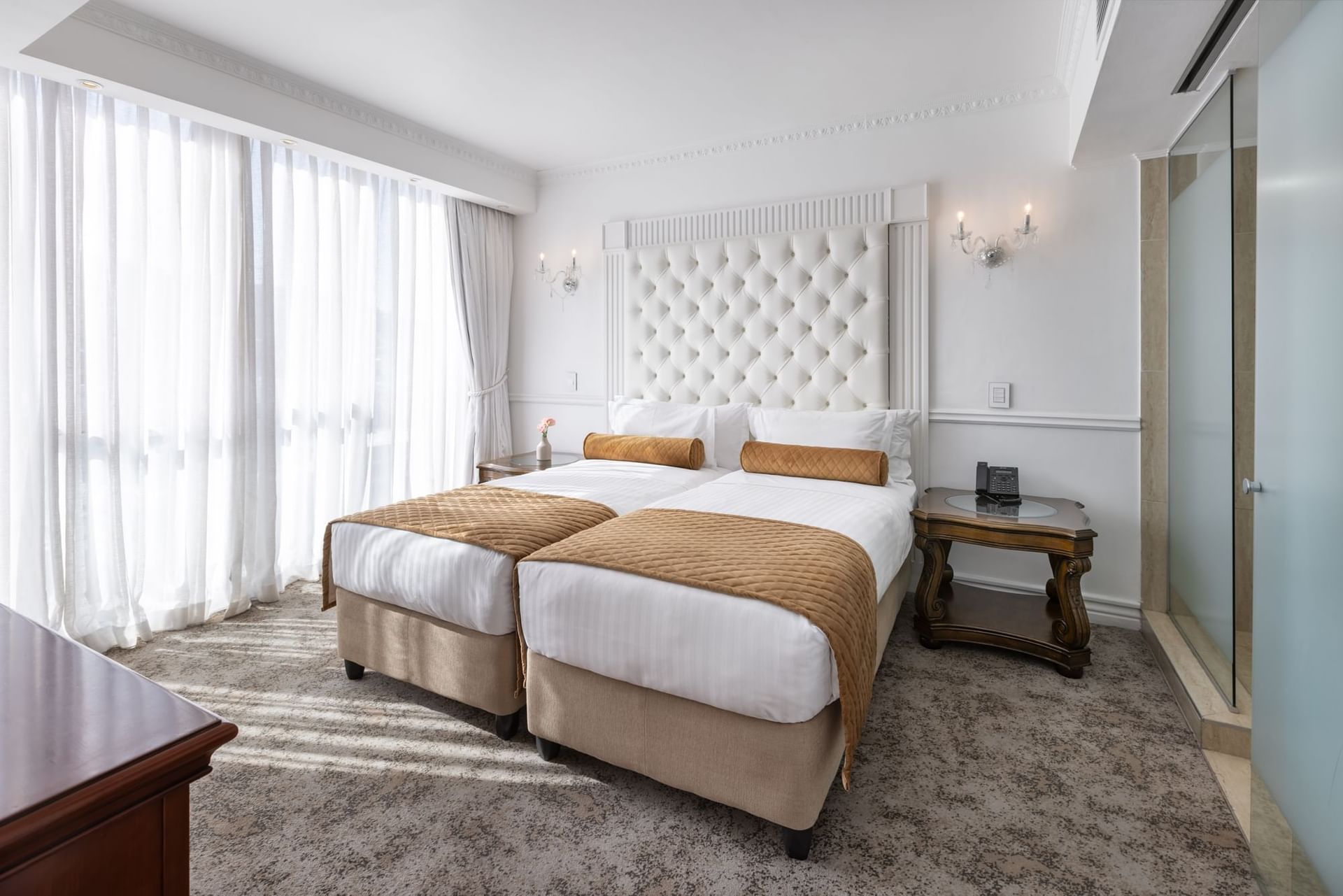 Imagínese en un estudio diáfano de 33 m²/352 ft² con impresionantes vistas a Ciudad del Cabo desde los ventanales que permiten que la luz natural ilumine el espacio. Algunos de nuestros Estudios Deluxe en Ciudad del Cabo cuentan con balcón y vistas a la Montaña de la Mesa, Signal Hill o la Bahía de la Mesa. Le encantarán los amplios baños privados con bañera, ducha o ambas.