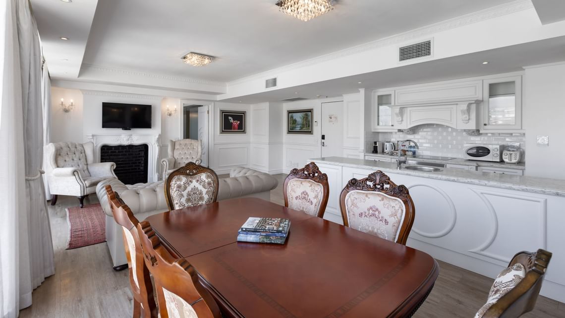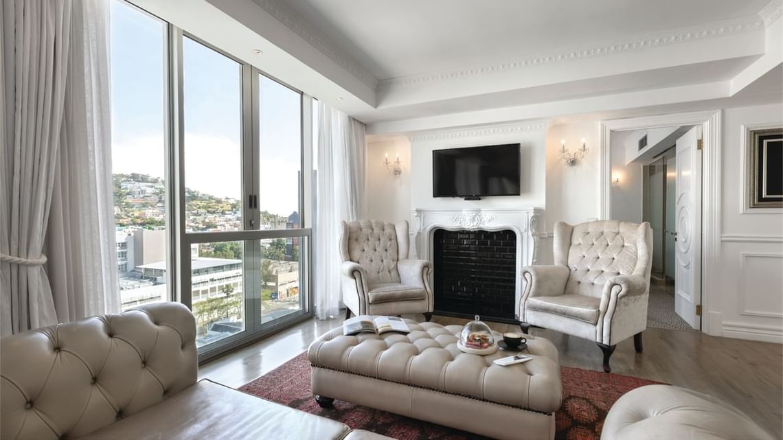 La Suite Presidencial ofrece un diseño dúplex de dos niveles de 209 m²/2250 ft², la personificación del espacio y la comodidad de un hotel de 5 estrellas en Ciudad del Cabo. Le recibirá una cocina totalmente equipada con encimera de mármol blanco que le conducirá a una sala de estar que aprovecha al máximo la luz natural, mientras que la madera oscura y los coloridos acabados orientales crean un contraste equilibrado con el diseño general. Relájese en los sofás de cuero capitoné mientras el crepitar del fuego de su chimenea privada crea el ambiente perfecto para una noche de relajación. La Suite Presidencial cuenta con tres dormitorios con vistas panorámicas de suelo a techo, todos con baño privado, ducha de efecto lluvia y bañera. Salga a su piscina privada y solárium con vistas panorámicas de la ciudad, enmarcadas por la Montaña de la Mesa y la Cabeza de León.