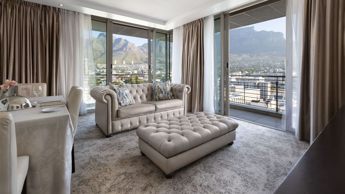 Nuestras Suites de un Dormitorio ofrecen espacios de 53 m² (570 pies²) con una sala de estar independiente. El interior de estas suites ofrece una decoración limpia y elegante o un interior cálido y acogedor con toques de colores vibrantes. Algunas de nuestras Suites de un Dormitorio tienen balcones con vistas de postal a la Montaña de la Mesa, Signal Hill, el centro de la ciudad o la Bahía de la Mesa.